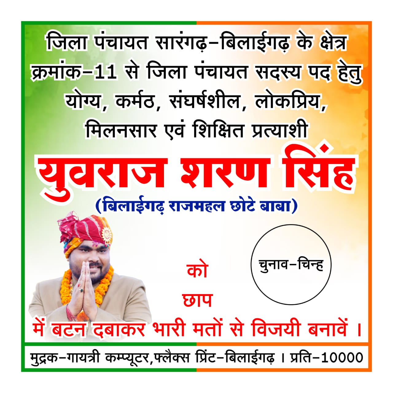 गौर करने योग्य बात है कि जहां भाजपा ने जिला पंचायत क्षेत्र क्रमांक 11 से राजमहल से युवराज शरण सिंह को प्रत्याशी घोषित किया है तो वही बिलाईगढ़ क्षेत्र में उनकी अच्छी खासी पैठ है और खास करके युवाओं के बीच युवराज शरण सिंह खासी लोकप्रिय युवा चेहरे के रूप में जाने जाते हैं। उक्त क्षेत्र की जनता को इस बात पर पूरा भरोसा है कि युवराज शरण सिंह प्रचंड मतों से जीतकर जिला पंचायत क्षेत्र क्रमांक 11 से सदस्य बनेंगे।
