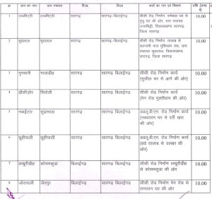 इसमें सारंगढ़-बिलाईगढ़ जिला के दहिदा, कोसीर, नोहरपाली, देवसागर, मधाईभाठा,कोसमकुंडा, डुरूमगढ़, हरदी, सारंगढ़ के उच्चभट्ठी, सुवाताल, नुनपानी, गाताडीह, डौकीजोर, सिरोली, नकईटार, सुंद्राभाठा, छुहीपाली तथा बिलाईगढ़ के लखुरीडीह, कोसमकुंडा,जोरापाली,जैतपुर,पीपरदुला मे अधोसंरचना मद से लाखो रूपये के सीसी रोड़ की स्वीकृति प्रदान किया गया है। वही उच्चभिटठी,सुवाताल, महकमपुर,छिन्द, अमलडीहा बिलाईगढ़ के डोकरीडीह, सिंधीचुवा,देवसागर, खम्हरिया में भी लाखो रूपये के पुलिया निमार्ण सह सीसी रोड़ निमार्ण कार्य की स्वीकृति प्रदान किया गया है। वही बाढ़ आपदा मद अंतर्गत सुरक्षा दिवाल सह पुलिया निर्माण में कपरतुंगा, परसकोल,परसदा छोटे, बुदेली, कपरतुंगा, परसकोल, बागबंध, खम्हारपाली, बुदेली तथा बिलाईगढ़ के तौलीडीह (सरसीवा),नवापारा (सरसीवा),मल्दी, घरजरा,जैतपुर, पिकरीपाली, सुकर उरकुली, धनगांव, तौलीडीह, गंगोटी, झुमका, जैतपुर, गेड़ापाली, धारासीव, सिलियारी, रक्शा का नाम शामिल है।