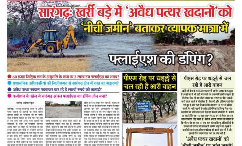 सारंगढ़-बिलाईगढ़ जिला में अवैध पत्थर खदानो को कागजो पर नीची जमीन बताकर लाखो टन फ्लाईएश को डंप करके मोटा कमीशन गटकने का बड़ा खेल चल रहा है। एक तरफ जहा अवैध पत्थर खदानो को कार्यवाही के स्थान पर फ्लाईएश डालकर अवैध खनन का सबूत को नष्ट किया जा रहा है वही दूसरी