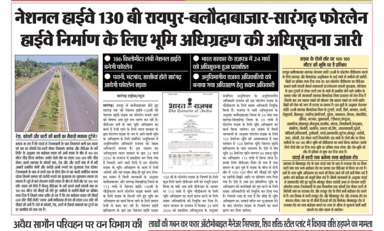 नेशनल हाईवे 130 बी रायपुर-बलौदाबाजार-सारंगढ़ फोरलेन हाईवे निमार्ण के लिये भूमि अधिग्रहण की अधिसूचना जारी